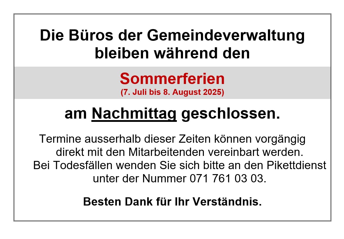 Die Büros der Gemeindeverwaltung in Oberriet bleiben während den Sommerferien vom Montag, 7. Juli 2025, bis Freitag, 8. August 2025, jeweils am Nachmittag geschlossen. Am Vormittag sind die Büros wie gewohnt von 08.00 bis 11.30 Uhr geöffnet. Termine ausserhalb dieser Öffnungszeiten können vorgängig direkt mit den Mitarbeitenden vereinbart werden. Bei Todesfällen wenden Sie sich bitte an den Pikettdienst unter der Nummer 071 761 03 03. Ab Montag, 11. August 2025, sind die Büros wieder zu den gewöhnlichen Öffnungszeiten erreichbar. Der Gemeinderat Oberriet dankt der Bevölkerung bestens für das Verständnis und wünscht sonnenreiche sowie erholsame Sommerferien!