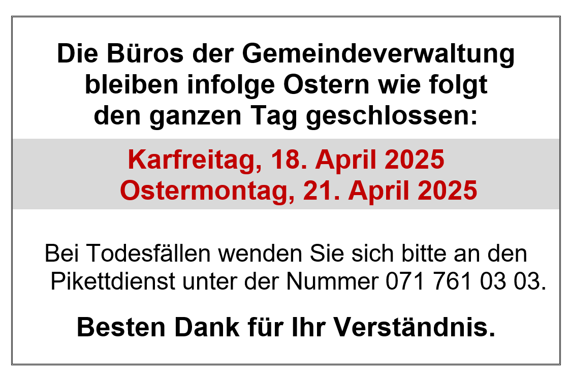 Die Büros der Gemeindeverwaltung und des Werkhofs Oberriet bleiben infolge Ostern wie folgt den ganzen Tag geschlossen: 18. April 2025 21. April 2025 In dringenden Fällen erreichen Sie die Pikettdienste unter folgenden Telefonnummern: Bestattungsamt: 071 761 03